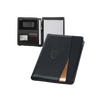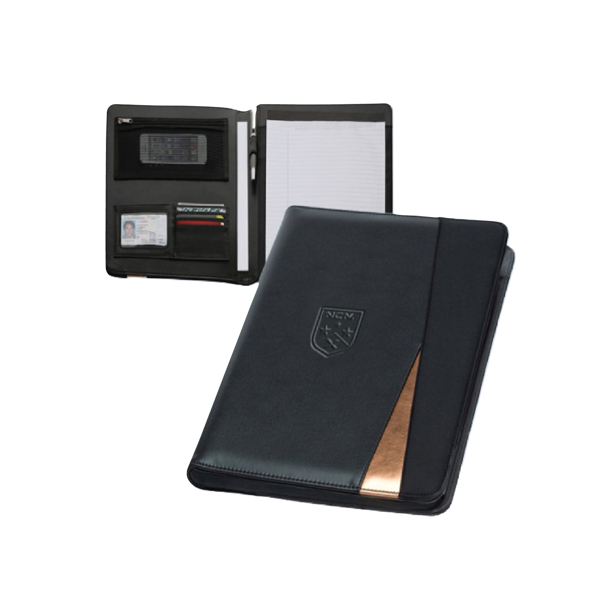 With its copper color and fabric accents, this black padfolio is as contemporary stylish as it is functional. The internal zip mesh pocket will keep your smaller items in place while the window ID holder and card holder adds to the functionality. The included 8.5" x 11" notepad and pen loop complete this head turning piece, with logo debossed to cover.